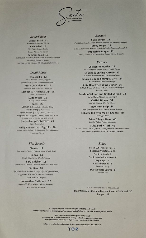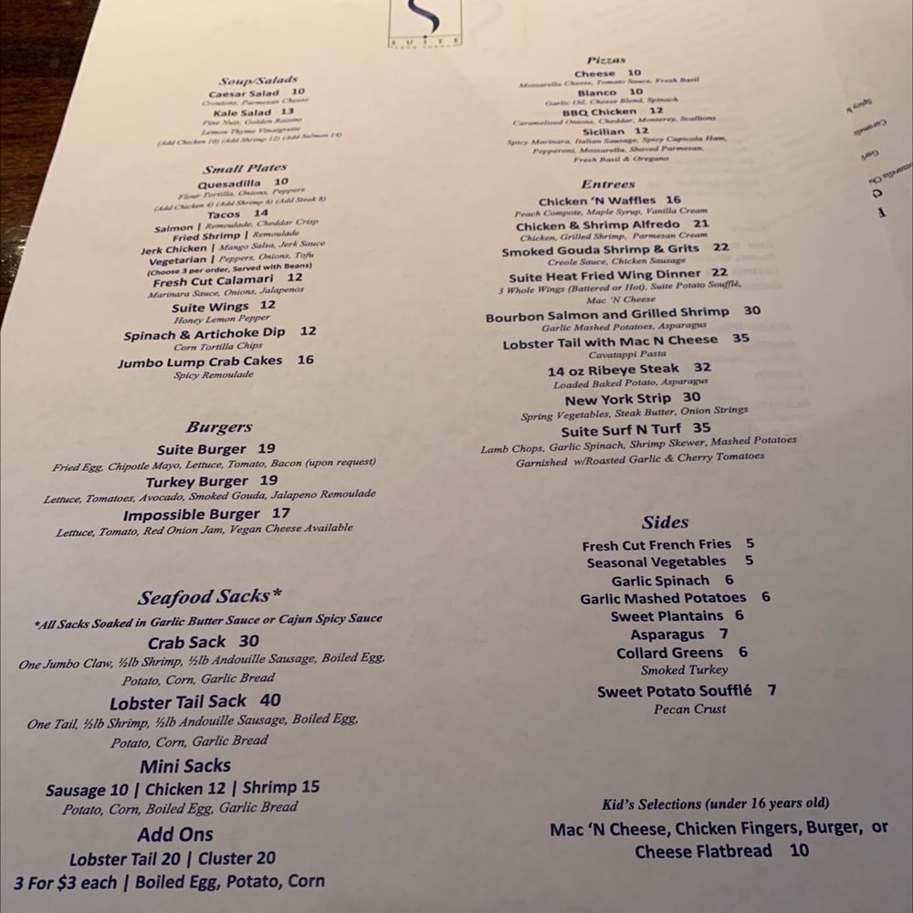 Suite Food Lounge is a trendy New American lounge located in Atlanta, GA. The menu offers a variety of options including vegan choices, limited vegetarian options, and unique twists on traditional dishes. The restaurant provides a vibrant atmosphere with DJ and live music, making it perfect for dinner or late-night dining. Happy hour specials and a full bar add to the lively experience. Guests can enjoy outdoor seating with heated and covered options. The staff provides excellent customer service, ensuring a memorable dining experience. With a menu that reimagines classic favorites like Mexican street corn and shrimp sliders, Suite Food Lounge is a must-visit spot for those looking for great food and a fun vibe.